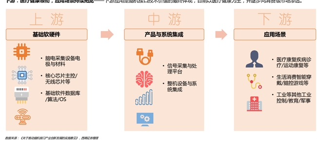 中游:多技术路线并行,系统集成百花齐放——系统集成与软硬件平台是产业枢纽下游:医疗健康领衔,应用场景持续拓宽——下游应用是脑机接口技术价值的最终体现,目前以医疗健康为主,并逐步向消费级市场渗透。