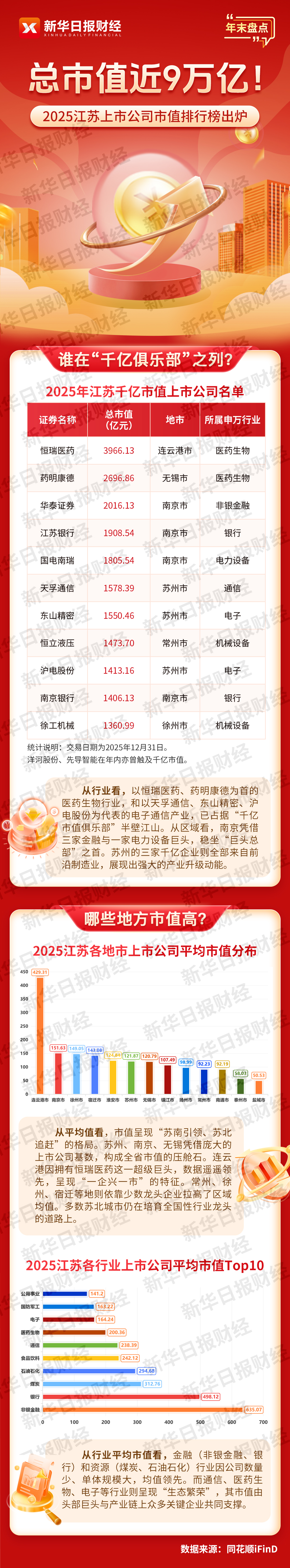 截至2025年末,江苏721家上市公司总市值已近9万亿元,在全国A股市场中的分量愈发凸显。其中,象征顶尖企业实力的 “千亿市值俱乐部”,共有11名成员。