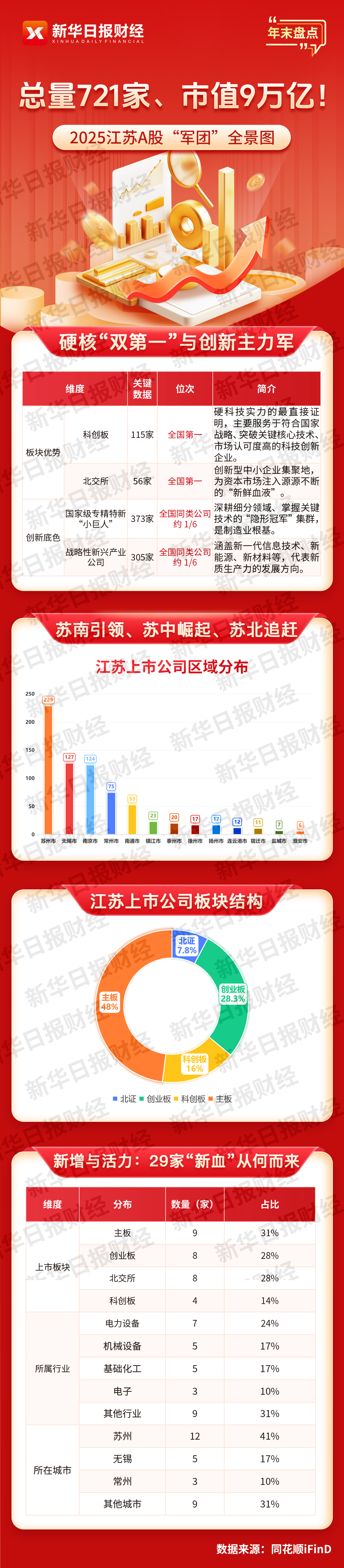 截至2025年末,江苏A股上市公司总数达到 721家,总市值稳步攀升至近 9万亿元。这一年,全省新增上市公司 29家,新增数量占比全国新增四分之一,位居全国第一。