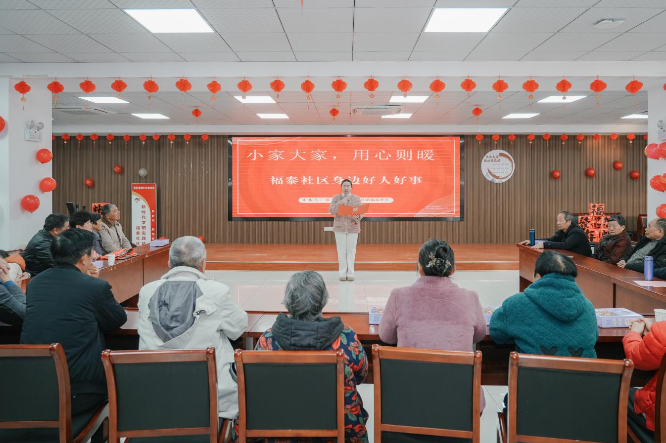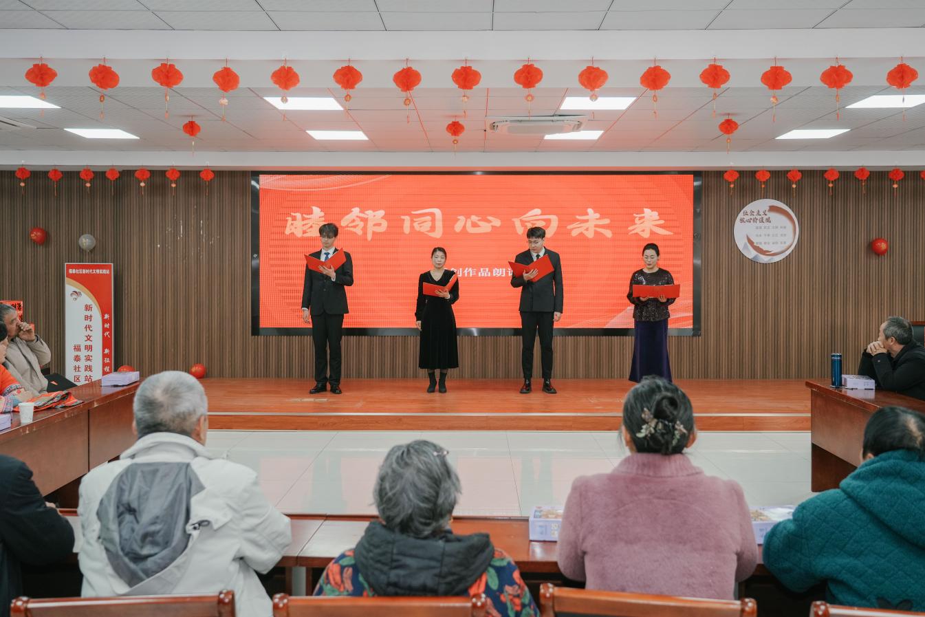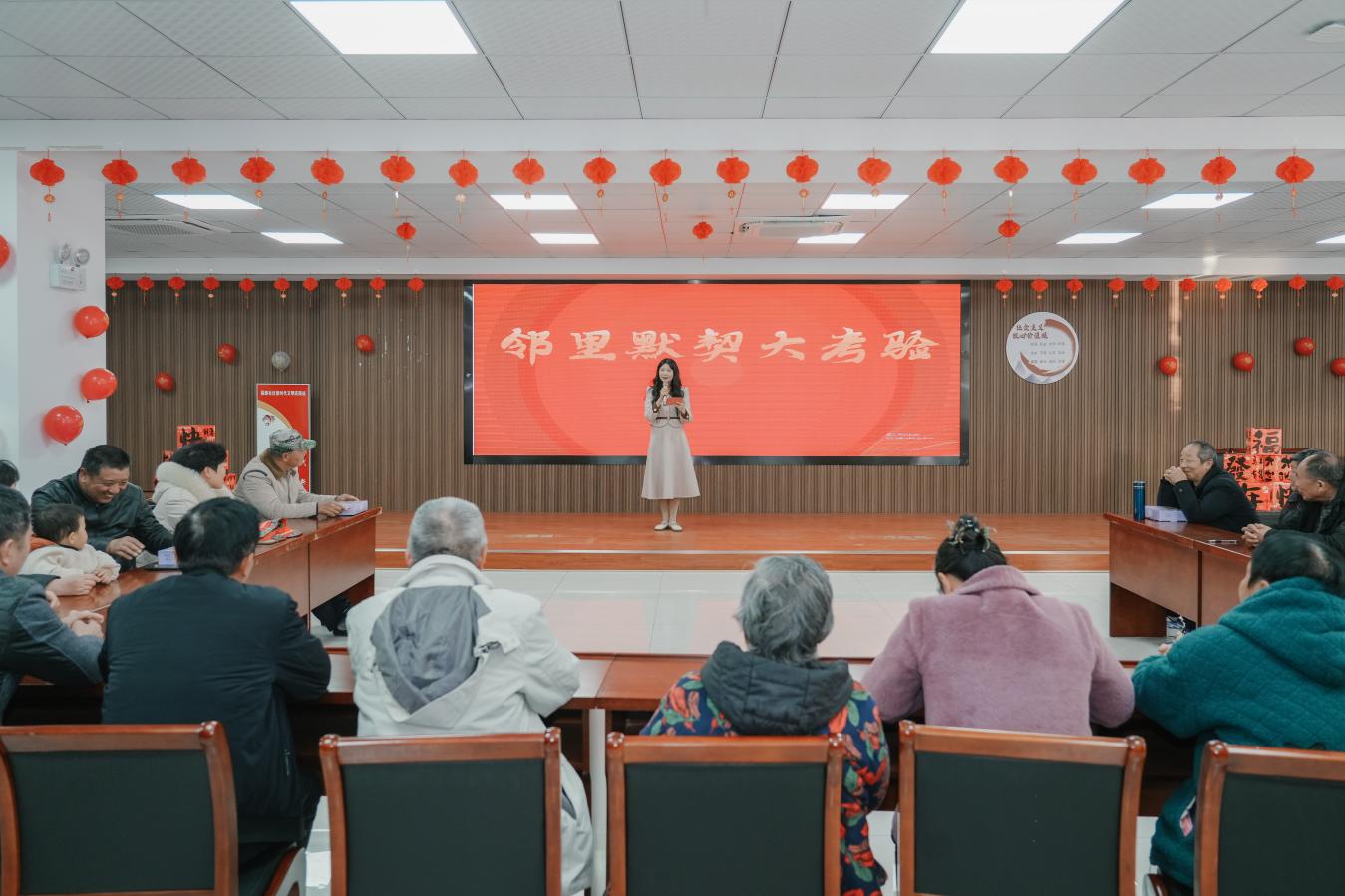 文艺展演环节,居民代表身着喜庆的服饰,携手带来经典贺岁歌曲《好运来》。台下观众跟着节奏轻轻哼唱,掌声与歌声此起彼伏;歌声落幕,社区干部代表集体登台,深情朗诵原创作品《睦邻同心向未来》。他们用铿锵有力的语调,诉说着社区工作者为民服务的初心使命,真挚的情感引发了现场居民的深刻共鸣,台下不时响起热烈掌声。此外,社区干事通过图文并茂的PPT,生动讲述了社区内的感人事迹——有热心居民主动帮扶独居老人,有“身边好人”捐献造血干细胞……一个个暖心故事,让无私奉献的精神在潜移默化中传递,为节日增添了一抹温情底色。