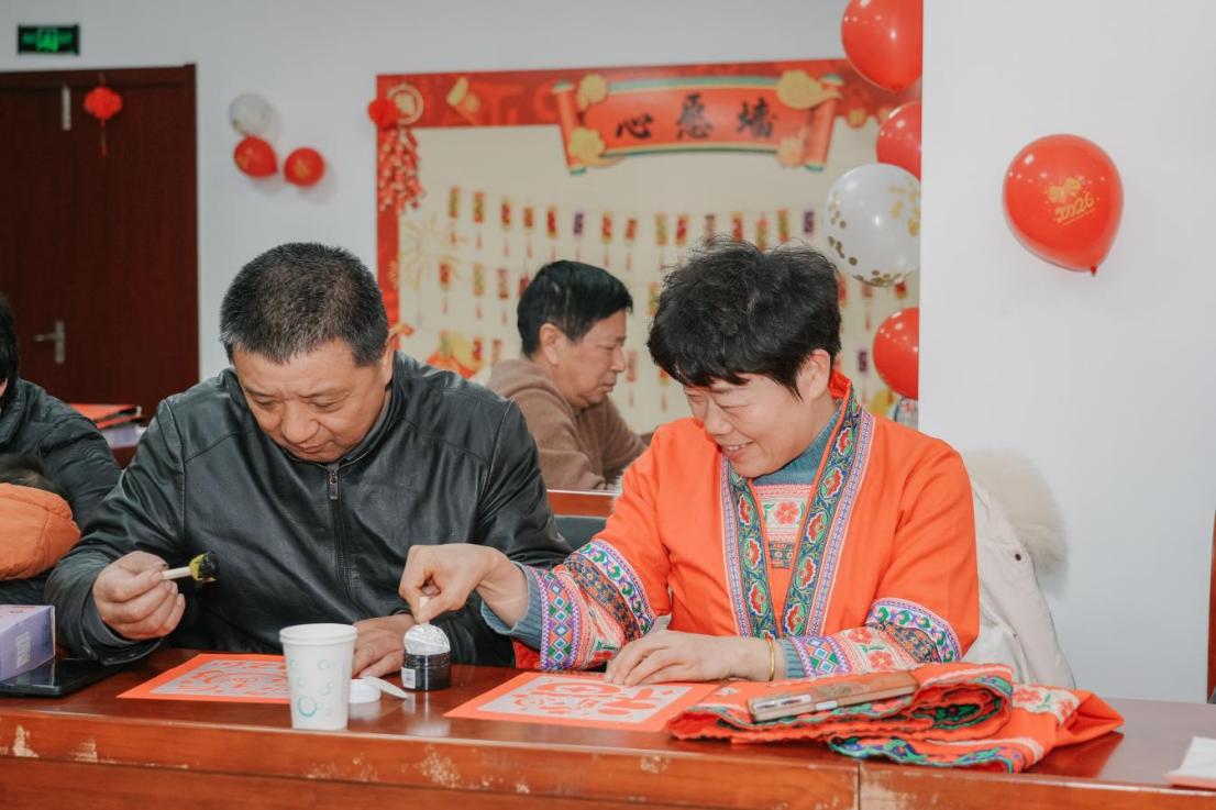 手工体验环节,新年的喜乐氛围扑面而来。“籽籽同心”少数民族志愿者为大家发放提前准备好的拓印工具,耐心地指导大家制作福字拓印贴画。“先把宣纸铺平,再蘸取适量墨汁,轻轻按压……”志愿者们手把手教学,大家小心翼翼地勾勒轮廓;邻里间相互帮忙,分享着创作的技巧与乐趣。指尖流转间,一幅幅带着墨香与温度的福字作品新鲜出炉。红色的宣纸搭配着寓意吉祥的花纹,每一幅都独具特色。大家捧着自己亲手制作的福字,脸上洋溢着幸福的笑容,纷纷拍照打卡,定格这份独特的新年记忆。