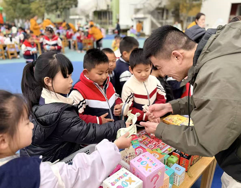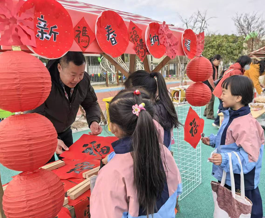 传统文创铺里,孩子们亲手体验剪窗花、写“福”字的乐趣;传统美食铺前,爆米花、烤山芋、糖画等传统小吃香气四溢,孩子们大快朵颐;传统游戏铺内,抢椅子、套圈、投壶、跳房子等民间游戏让大家玩得不亦乐乎,欢声笑语此起彼伏。
