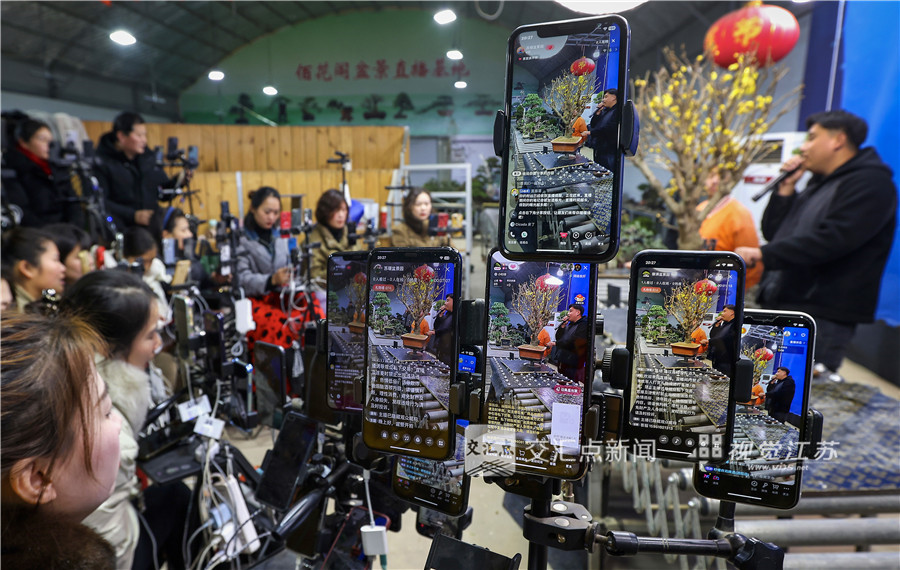 1月14日,在宿迁市沭阳县新河镇百花阁盆景直播基地,几十位主播赶着夜色参加“矩阵直播”,场面壮观。如今“矩阵直播”已成为沭阳一张名片,助推“沭派”花木盆景畅销国内外市场。