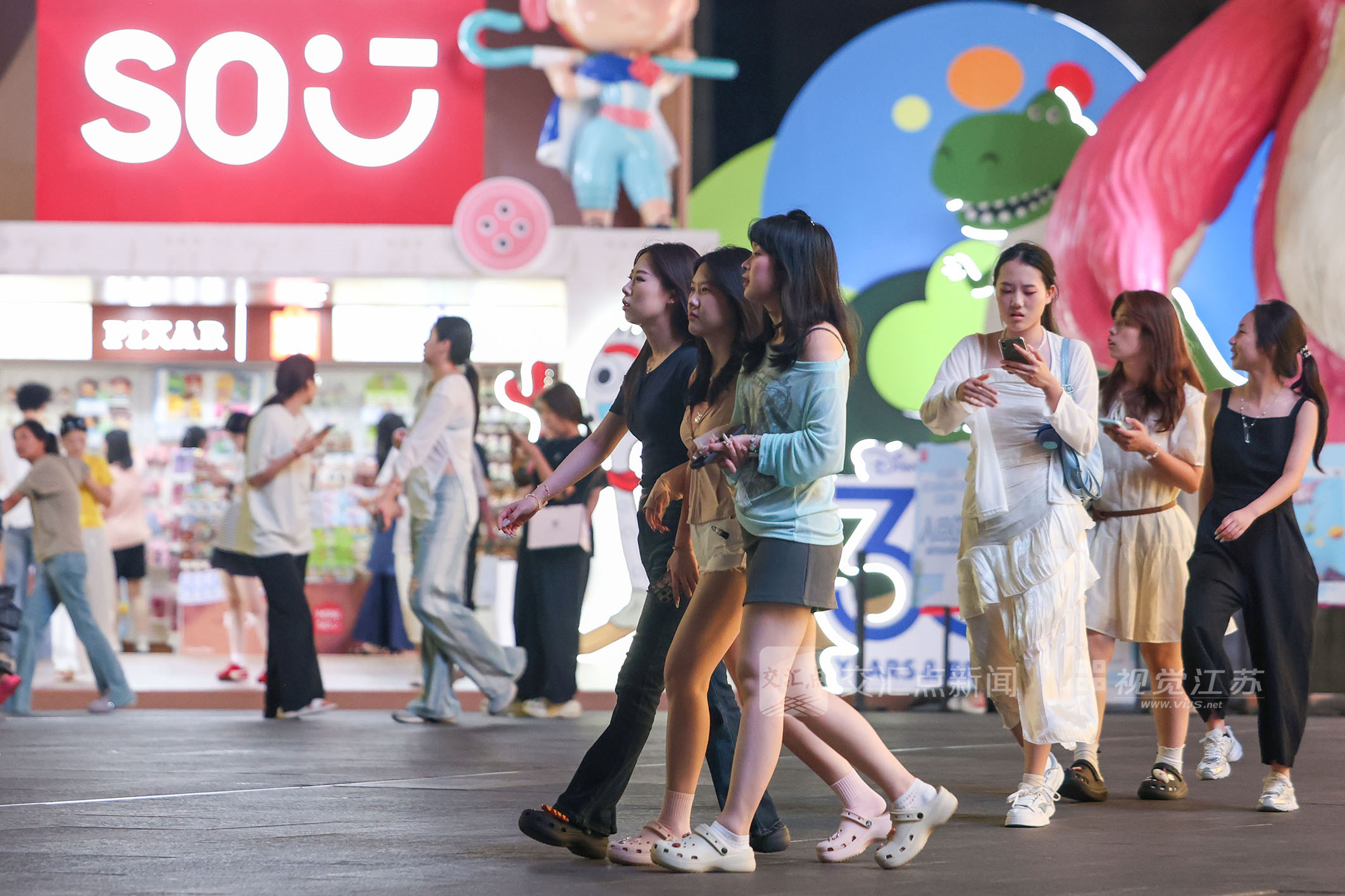 6月18日晚,市民和游客在南京市新街口商圈休闲购物。此前,江苏省商务厅公布50个“江苏省夜间消费集聚商圈(步行街)”名单,全省各级商务主管部门正积极引导集聚商圈(步行街)抓住暑期夜间消费旺季的契机,拓展“夜娱”“夜赏”“夜游”等新模式、新业态、新场景,更好满足人们个性化、多层次的夜间消费需求。