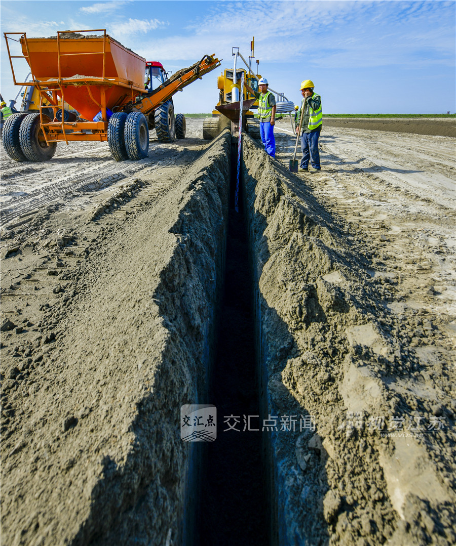 8月5日,施工人员预埋涵管构建地下排水系统,进行土壤脱盐碱核心工序。