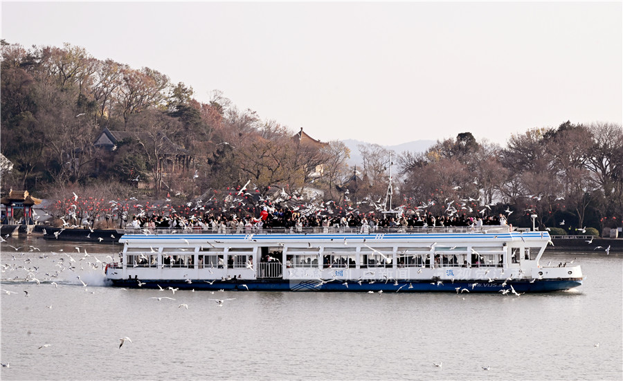 1月2日,无锡市太湖鼋头渚风景区,大批西伯利亚红嘴鸥迁徙南下,驻足过冬。冬日精灵“红嘴鸥”跟随轮船飞行,为太湖点缀浪漫的色彩。据悉,2024年太湖水质指标全年达到Ⅲ类,是依法治理以来首次达到“良好”湖泊标准。新的一年,太湖游船时隔20余年重启。