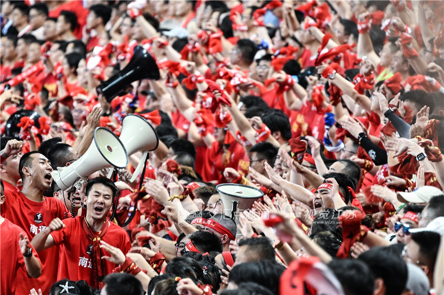 7月19日,“苏超”南通队主场对阵盐城队,26383名观众挤爆如皋体育场。南通队2比1胜盐城队,但真正震撼全场的却是两地球迷的巅峰较量,盐城队球迷高歌《为了盐城队》,南通球迷则以自创的狼吼展开助威。