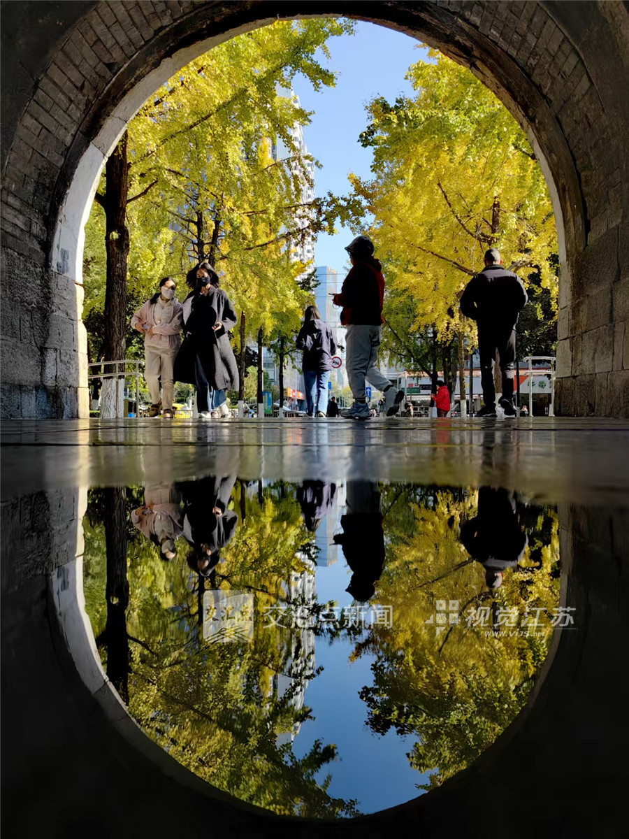11月20日,游客在南京市汉中门广场银杏树下驻足欣赏。