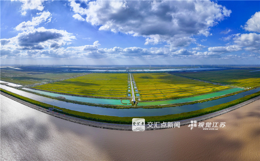 10月23日,临海远眺数千亩良田,该地亩产创下江苏沿海盐碱耕地种植新高。