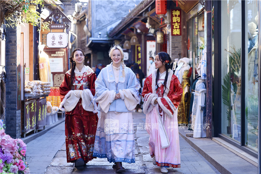 11月25日,来自白俄罗斯的“资深”汉服爱好者Hanna Liutych(右二)与她的朋友们款款行走在淮安市河下古镇青石板街上,一同感受着中国服装与建筑之美。