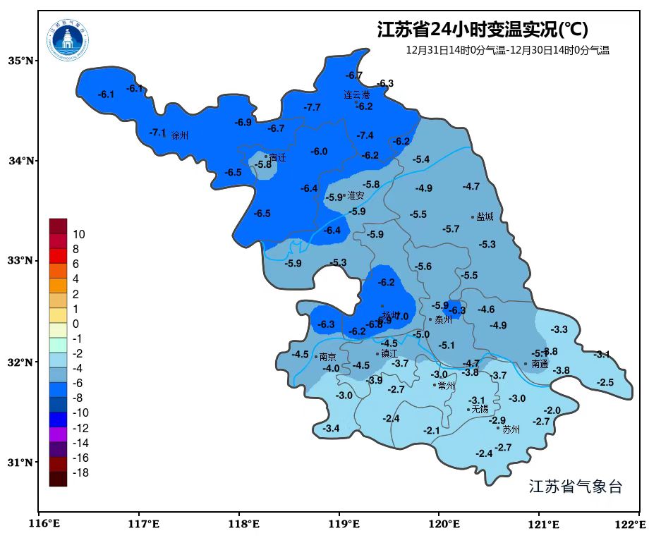据气象实况,12月31日白天江苏以阴到多云天气为主,各地气温呈现明显区域差异,下午2时苏南地区气温相对偏高,维持在10~11℃,淮北北部气温最低,普遍仅3℃上下,省内其余地区气温在5~9℃之间。受冷空气持续渗透影响,当日江苏气温已出现明显下滑,其中淮北地区较前一日同一时刻,气温降幅普遍达6℃,降温态势显著,气象部门特别提醒,降温天气下公众出行需做好全方位保暖防寒措施,谨防着凉。