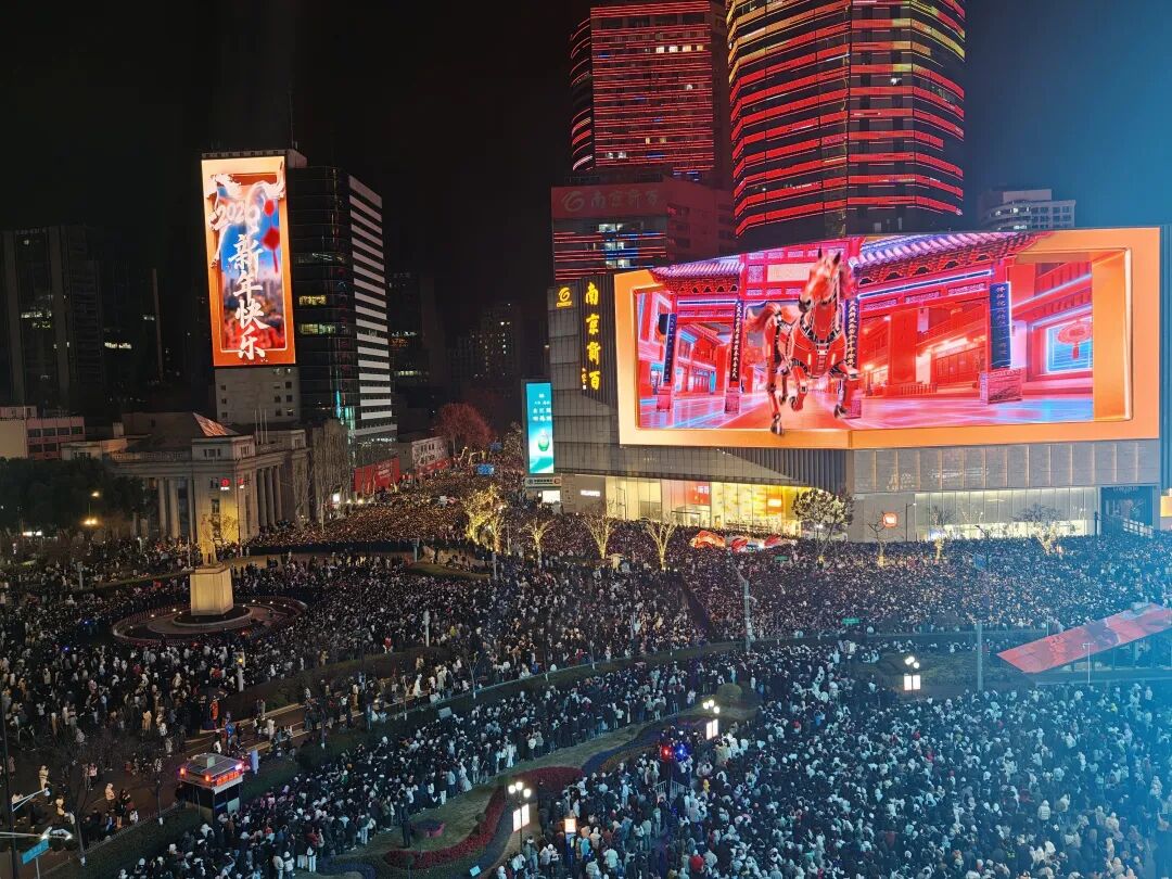 “5、4、3、2、1——新年快乐!”新街口商圈光影璀璨、人声鼎沸,18块户外大屏同步亮起倒计时,新年的钟声终于敲响。十余万市民游客齐声欢呼,笑容与灯光交融,南京城的夜空被跨年的喜悦点亮。
