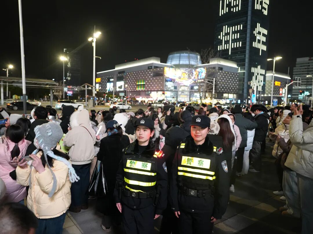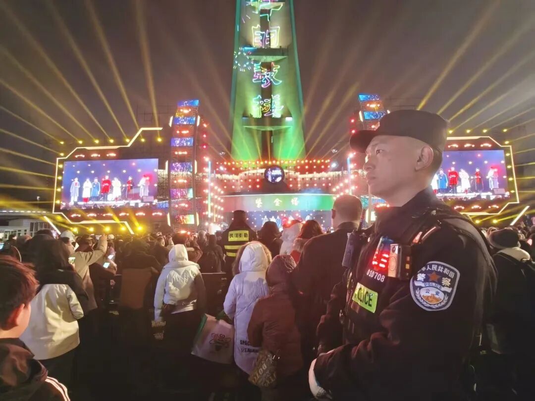 临近午夜,执勤警力持续引导人群向各大屏观看区有序聚集。数十架搭载喊话器的警用无人机在高空盘旋,根据指挥部指令开展空中巡查、喊话提示,形成“空地一体”的立体守护网。