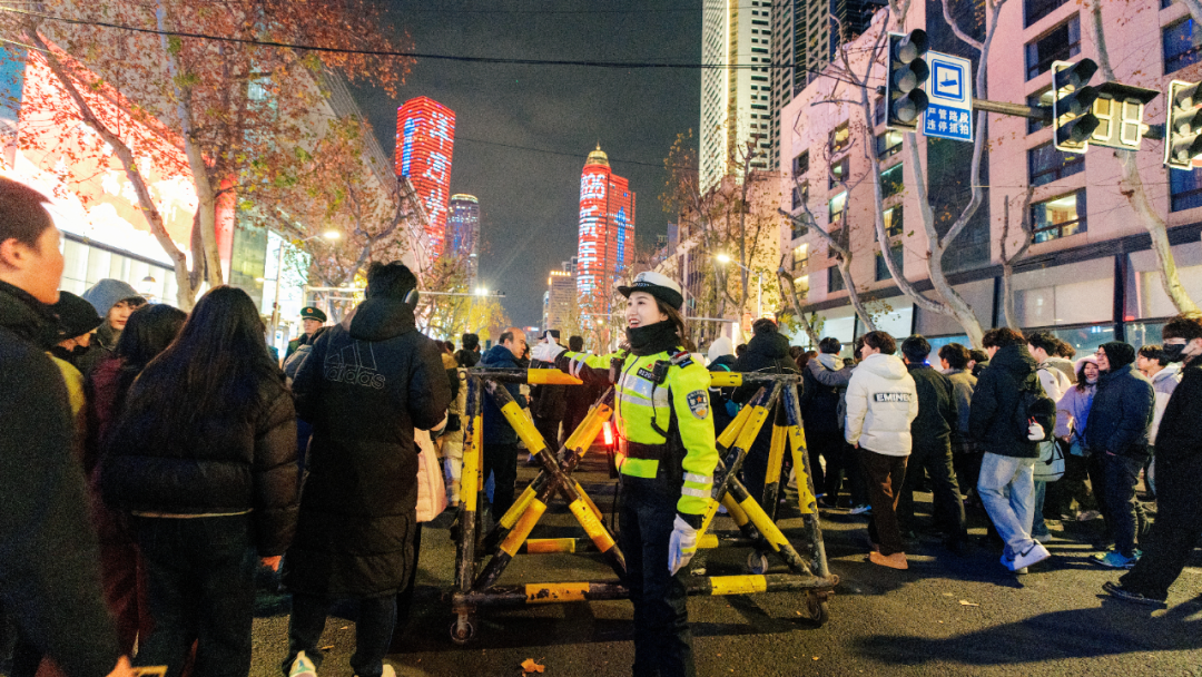 22:00,路面行人逐渐聚集。南京警方会同武警力量,在中山东路、中山南路、汉中路、中山路等主干道上搭设17组“门”式人墙,将路面划分为13个网格和1个中心区,形成多个客流“蓄水池”。每组人墙两端由民警把控出入口,既形成物理阻隔,也保留引导通道,实现对每个“蓄水池”内客流的精细调控。安保总指挥部通过大屏对“蓄水池”态势“一屏统览”,动态实施分流与波次放行,确保安全可控。许多群众驻足与这道独特而有序的“人墙”合影,成为跨年夜一道温情的风景。