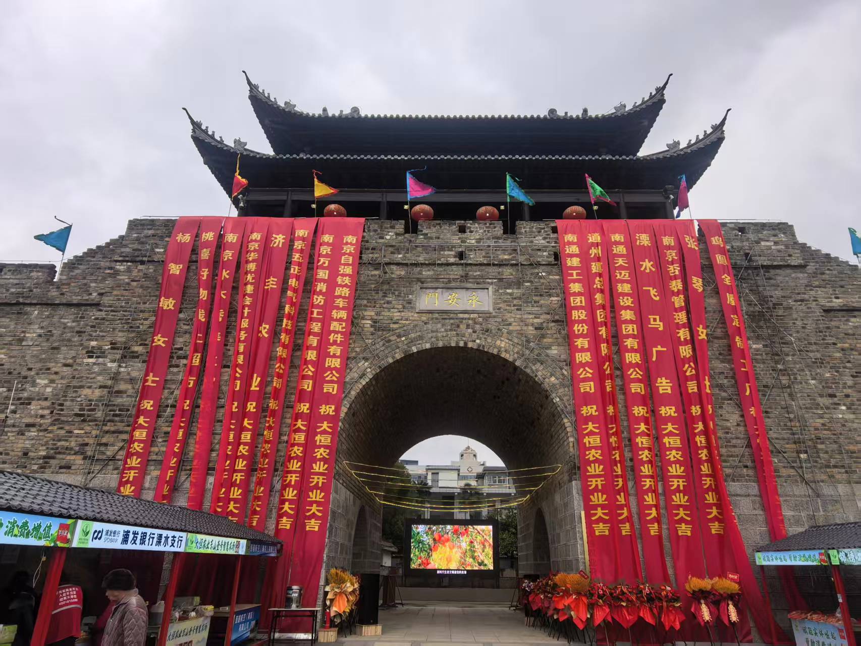 作为溧水老城更新的标杆之作,永安门承载着城市的历史记忆与时代新篇。这座复建的古城南门,雄踞城区核心、老城厢西南部寺桥片区,以“城门—广场—茶楼—舞台”的中轴线格局,串联起滨河公园、纪念碑广场等公共空间,既是市民休闲游憩的文化地标,更是城市活力绽放的核心场域。此次农展精准锚定永安门的地标属性,将主会场设于市民广场,分会场落位于城门展厅,让千年古城门与现代农展会交相辉映。