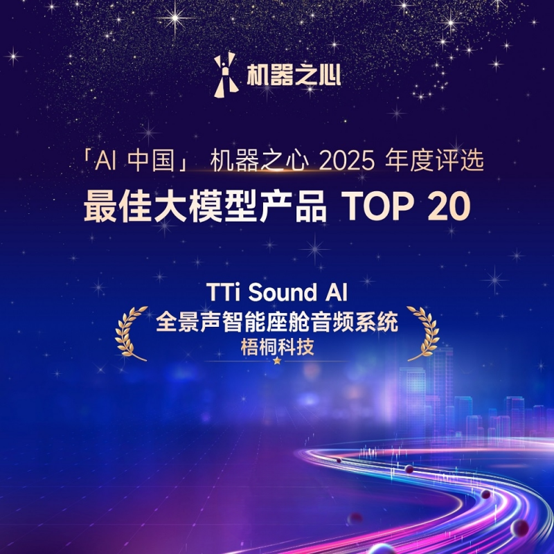12月31日,「AI中国」机器之心2025年度评选正式揭晓,梧桐车联科技有限公司(以下简称“TINNOVE梧桐科技”)旗下TTi Sound AI全景声智能座舱音频系统成功入选“最佳大模型产品TOP20”。该产品作为行业首发的由大模型驱动的车载音频方案,重塑座舱内听音体验,成为智能座舱领域AI大模型落地的典型代表。