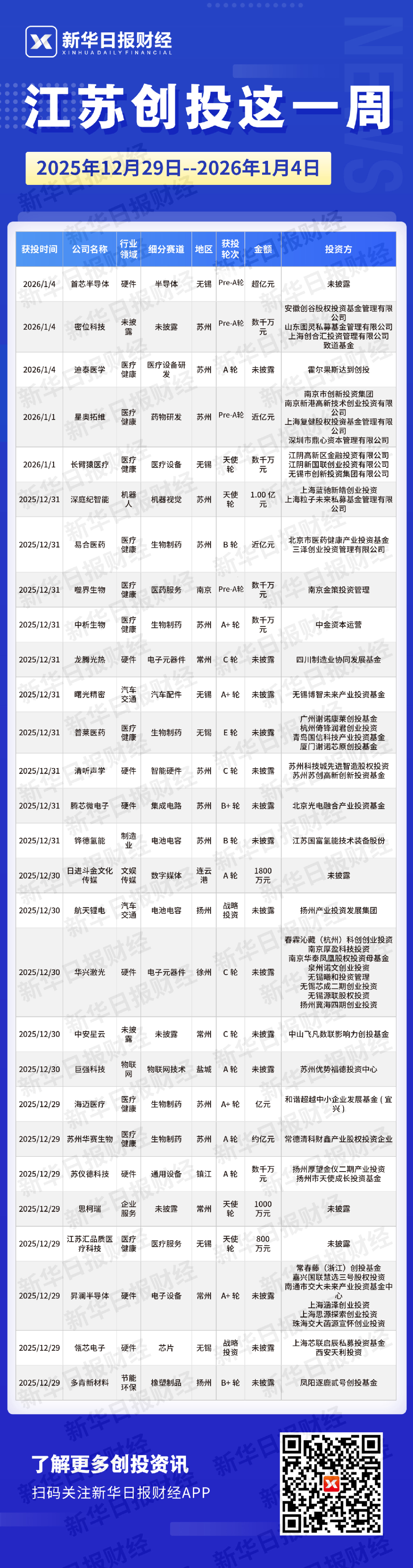 新华日报财经讯 本周(2025年12月29日-2026年1月4日),江苏创投共发生投融资事件28起,已披露的投融资总额超过7亿元。从行业分布来看,医疗健康10起,硬件8起,汽车交通2起,机器人1起,节能环保1起,企业服务1起,文娱传媒1起,物联网1起,制造业1起;从投融资轮次来看,A轮5起,A+轮、C轮、Pre-A轮、天使轮各4起,B+轮、B轮、战略投资各2起,E轮1起;从城市分布来看,苏州11起,无锡6起,常州4起,扬州2起,连云港1起,南京1起,徐州1起,盐城1起,镇江1起。