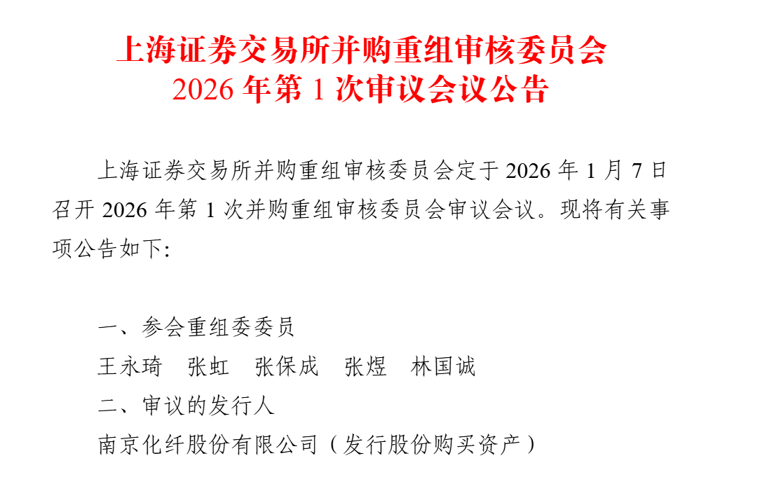 新华日报财经讯 记者从上交所获悉,该所并购重组审核委员会2026年第1次审议会议将于1月7日举行,审议南京化纤发行股份购买资产事项。这不仅是新年首场并购重组审核会议,也关系到一家老牌上市公司能否通过资产置换重获新生。