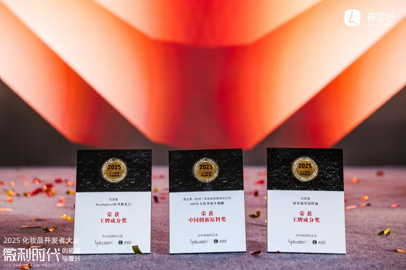在这场高规格赛事中,花皙蔻携三项牡丹原料参赛,从300多款创新原料中脱颖而出,成功斩获2025「了不起的中国原料」行业大奖——牡丹愈伤组织荣获「中国创新原料奖」,牡丹超萃活性油与Peolightyl牡丹耀光白荣获「中国王牌成分奖」。