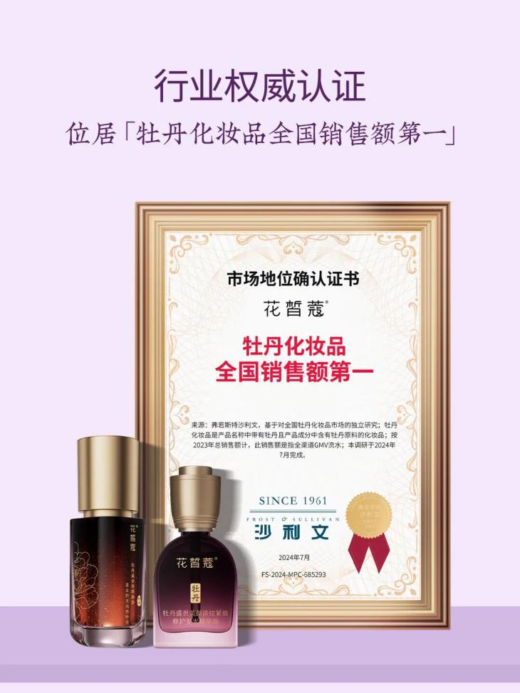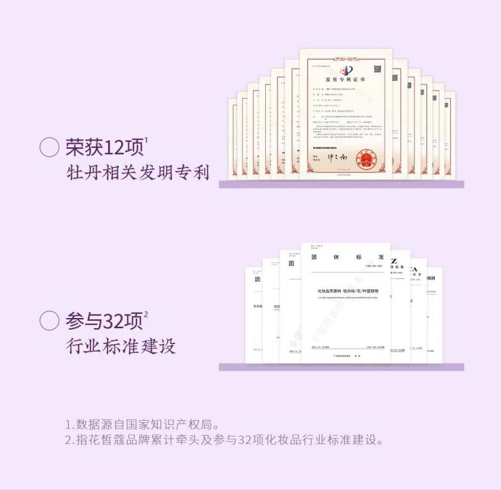 截至目前,花皙蔻已在国际学术期刊发表多篇牡丹相关科研论文,累计获得12项牡丹相关发明专利,参与制定32项行业标准建设,更获沙利文权威认证,荣登“牡丹化妆品销售额第一”宝座,以扎实的科研成果与市场表现,奠定行业领军地位。