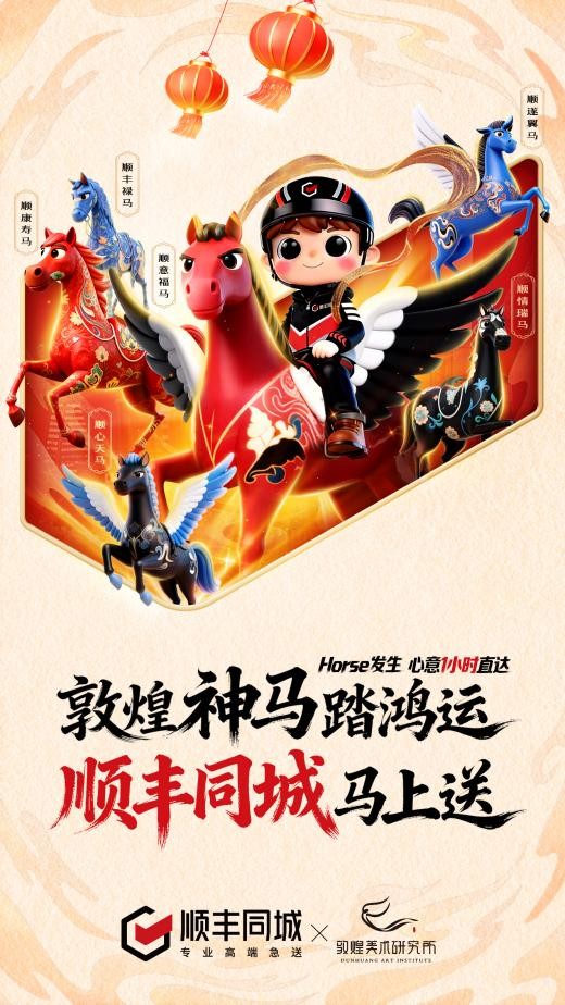 值得关注的是,在保障业务精细化履约的同时,顺丰同城通过文化跨界合作丰富服务内涵。此次携手敦煌美术研究所六匹神马形象,承载着对用户顺遂平安、鸿运相伴的美好祝福,为新年配送增添更多美好寓意与文化温度。