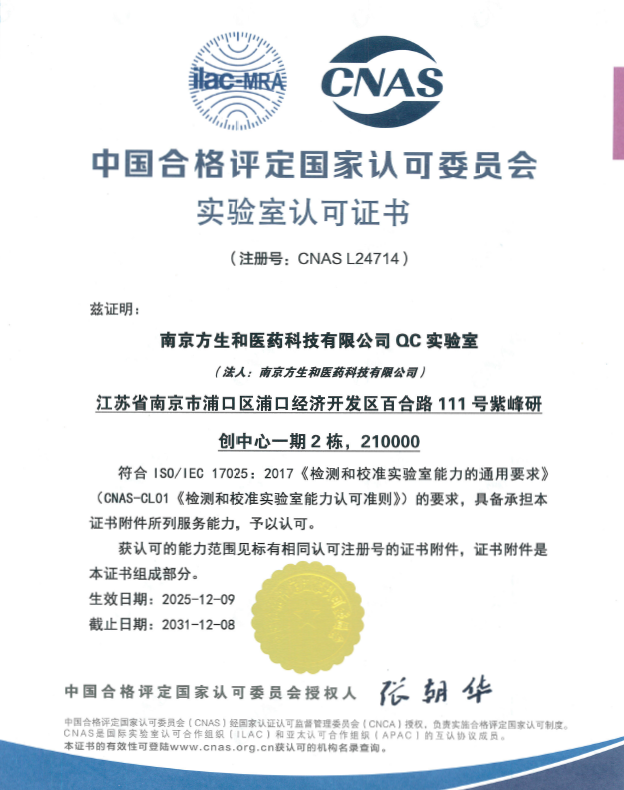 近日,位于南京江北新区浦口开发区的南京方生和医药科技有限公司(以下简称“方生和医药”)旗下实验室顺利通过中国合格评定国家认可委员会(CNAS)认可评审,获得CNAS实验室认可证书。这标志着该实验室的实验检测能力已经达到国际互认标准,将为高端产品技术开发、质量管控和国际市场拓展提供更有力支撑。