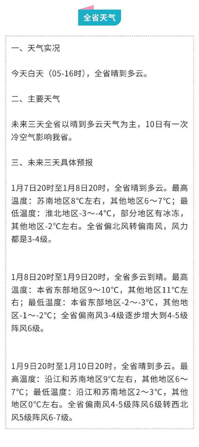 具体天气预报如下:1月7日20时至1月8日20时,全省晴到多云。最高温度:苏南地区8℃左右,其他地区6~7℃;最低温度:淮北地区-3~-4℃,部分地区有冰冻,其他地区-2℃左右。全省偏北风转偏南风,风力都是3—4级。1月8日20时至1月9日20时,全省多云到晴。最高温度:本省东部地区9~10℃,其他地区11℃左右;最低温度:本省东部地区-2~-3℃,其他地区-1~-2℃;全省偏南风3—4级逐步增大到4—5级阵风6级。1月9日20时至1月10日20时,全省晴到多云。最高温度:沿江和苏南地区9℃左右,其他地区6~7℃;最低温度:沿江和苏南地区2~3℃,其他地区0℃左右。全省偏南风4-5级阵风6级转西北风5级阵风6—7级。
