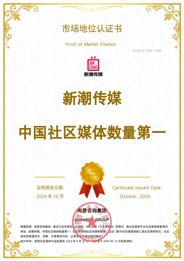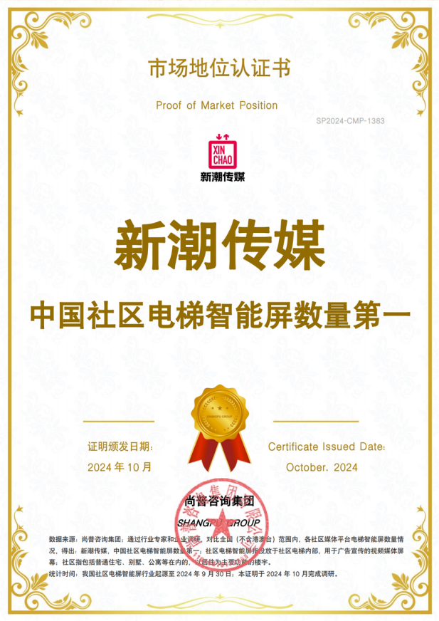4、2024年,根据调研公司调研证明:新潮传媒是中国社区电梯智能屏数量第一;新潮传媒中国社区媒体数量第一。