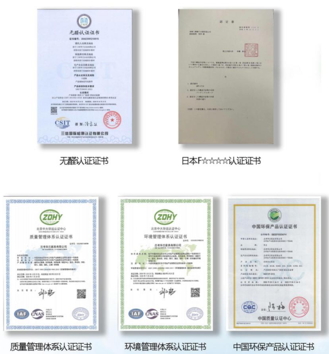 企业层面,三环华兰在“国家级高新技术企业”与“国家级林业重点龙头企业”等荣誉之外,更通过了“ISO三体系认证”,为从原料到成品的全流程确立了国际化标尺;产品层面,取得了“儿童安全级产品认证”“日本F★★★★认证”“无醛产品认证”等国内外严苛认证。这些权威背书让三环华兰的每一块刨花板都经得起健康考验、扛得住日常使用,也让越来越多的家庭、学校与商业空间,选择将信任交付给三环华兰。