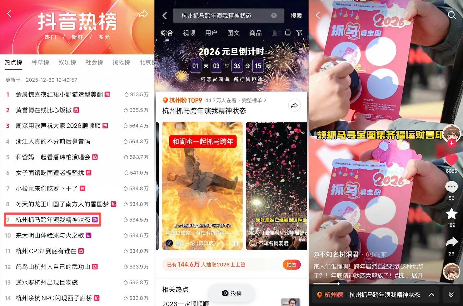 此外,下沙奥莱为将双旦活动影响力从场内延伸至全城,通过覆盖杭州多个核心地标的线下电子大屏进行全域宣传,强势霸屏观众视野。同时,活动与「抖音生活服务跨年季」进行深度融合,在商场内特设系列抖音心动主题DP打卡点,通过设计趣味性的打卡任务,有效激发了用户的参与和分享热情,成功将线上关注度转化为线下实际客流。期间,活动热点话题 #杭州抓马跨年演我精神状态一度登陆抖音热点榜TOP9,阅读量达534.5万。
