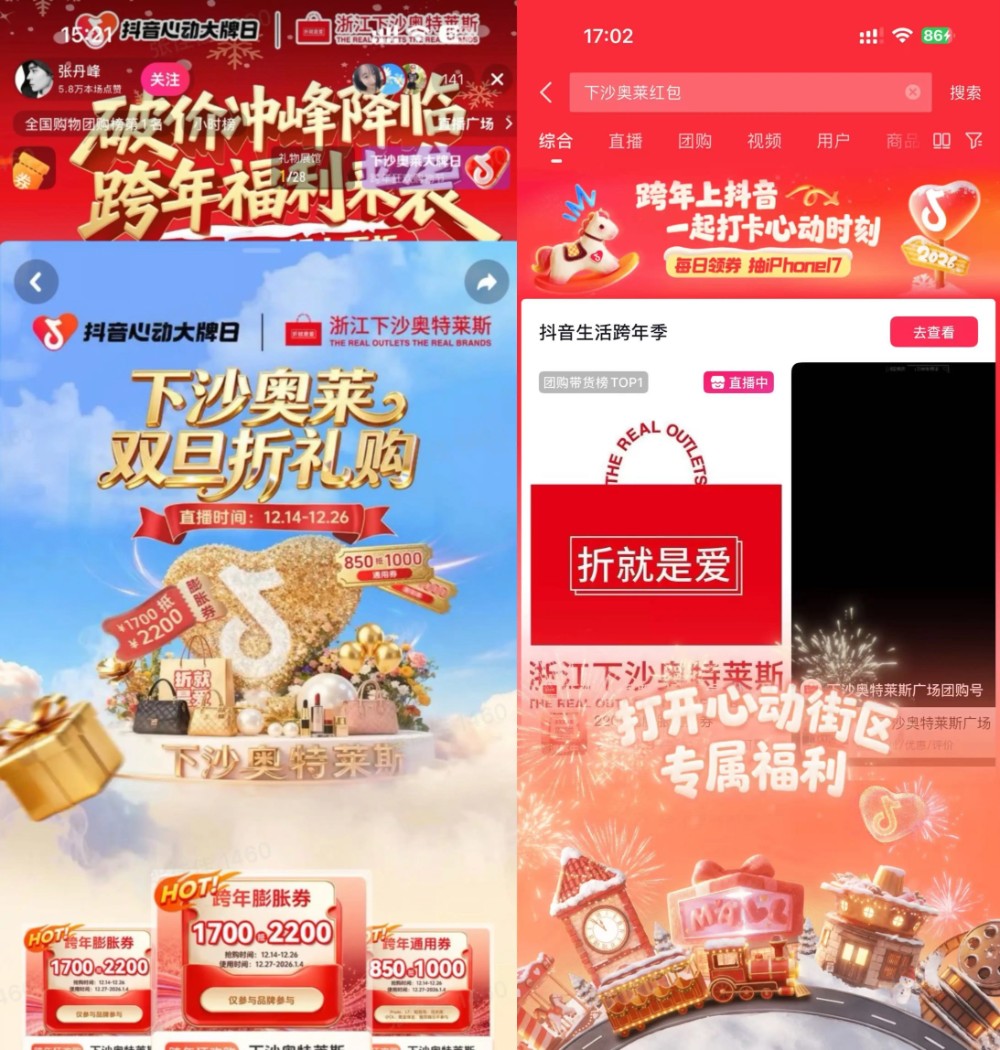 为响应这份对美好生活的向往,2025年12月14日至12月26日,全国头部奥莱商场——浙江下沙奥莱,携手「抖音心动大牌日」IP,共同开启“双旦折礼购”跨年购物节。线上,通过明星与超头达人直播释放声量,推出“年度精选货盘”;线下,打造沉浸式跨年打卡活动,汇聚人气。这场深度联动,为消费者构筑了一个从线上种草到线下体验的完整节日消费旅程,让为新年准备的每一份心意,都满载惊喜。