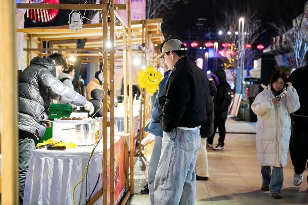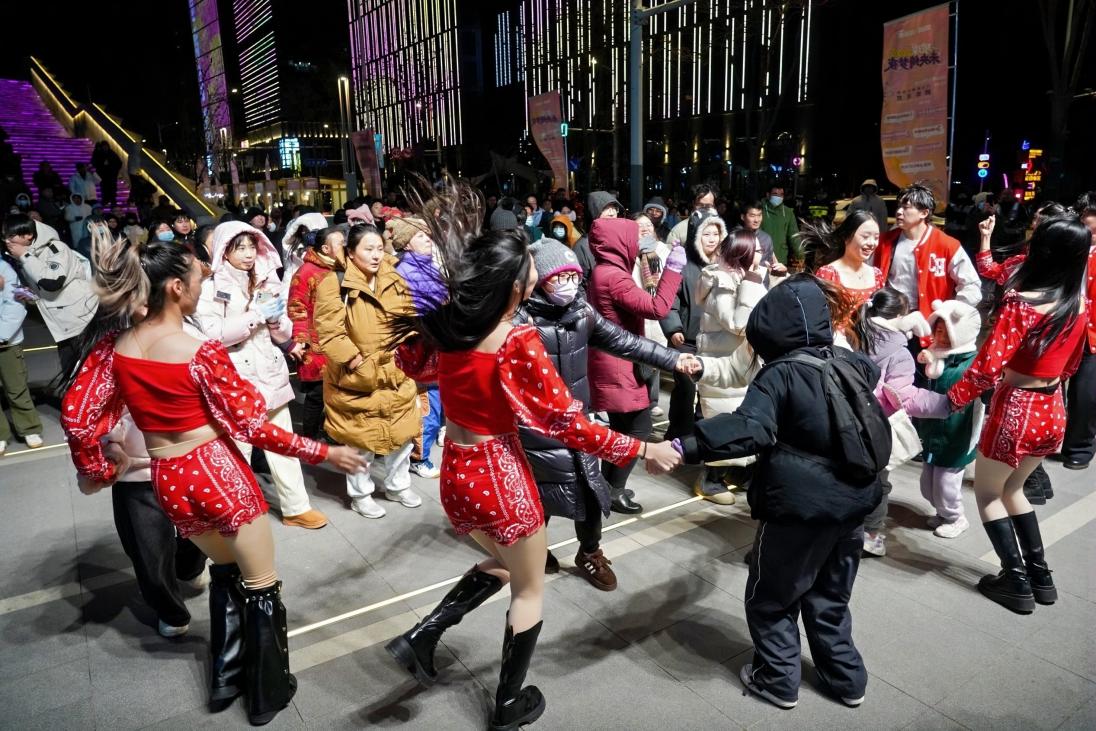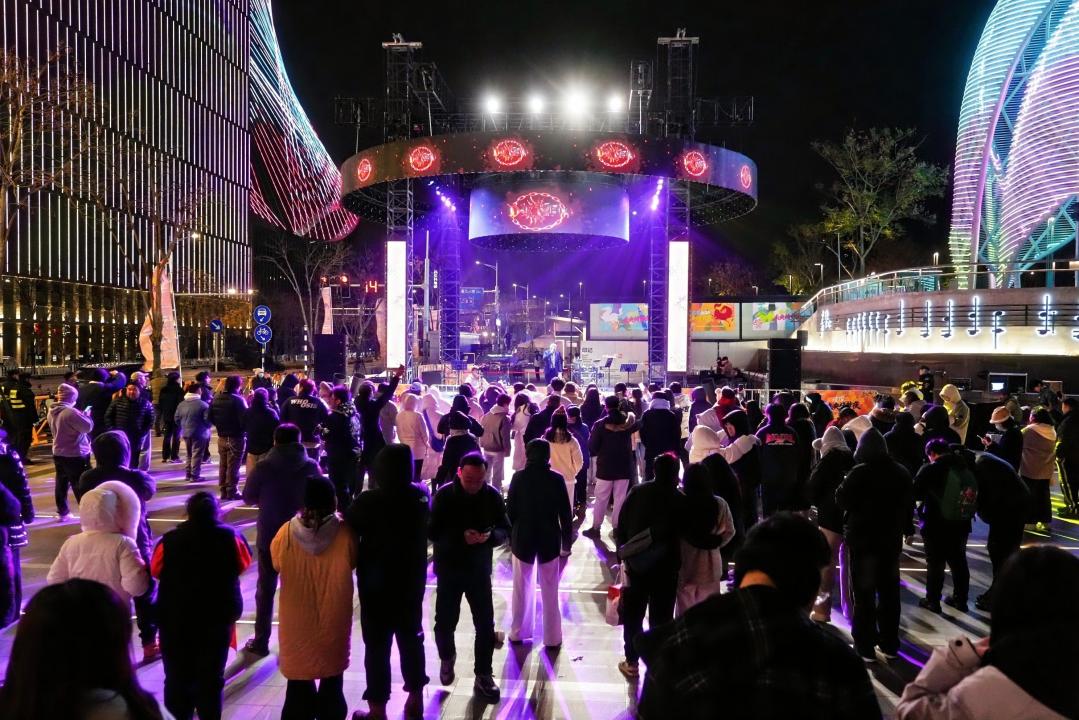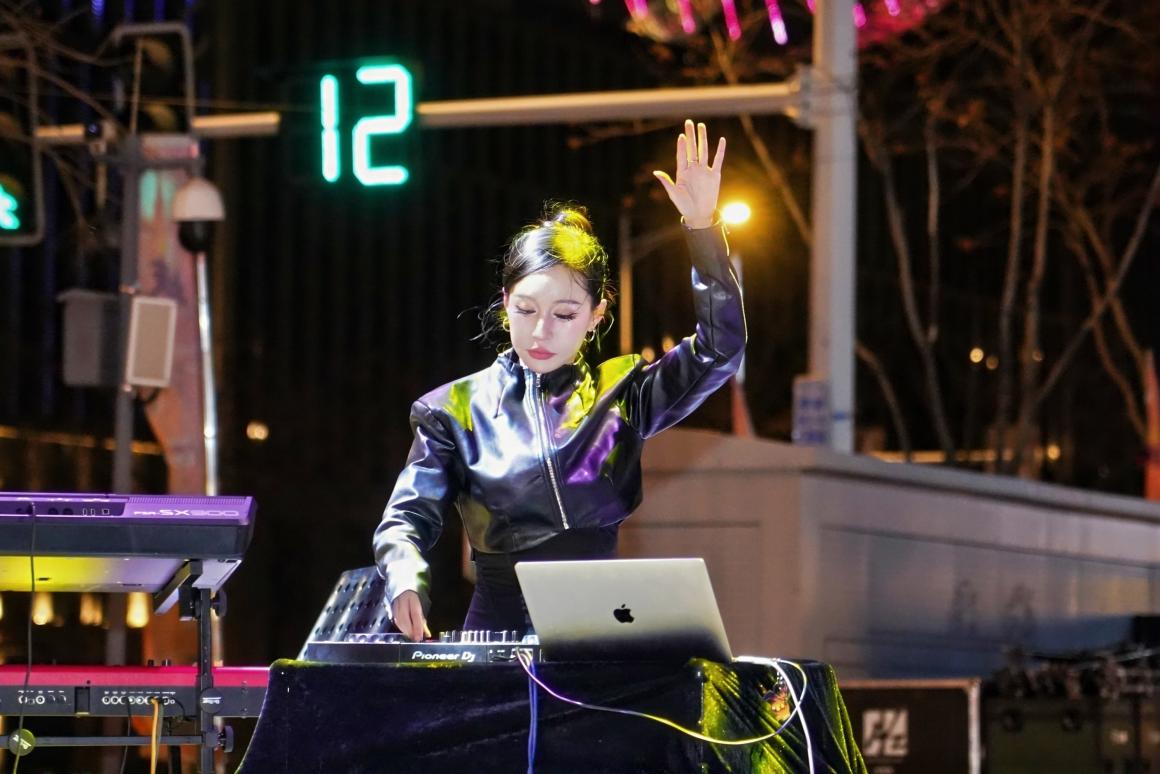 一场持续到深夜的电音热舞派对也在街区上演,当舞台灯光亮起,“DJ表演秀”用复古千禧风音乐节奏引导人群,在现场引起阵阵热舞浪潮。“八方来财快闪舞”“抖音热舞串烧”“电子民乐表演随舞秀”等精彩演出将舞台上的DJ、乐队、演员与台下观众的情绪激发出热情欢乐的声场,最终在“跨年主题歌友会”的合唱中抵达新年。