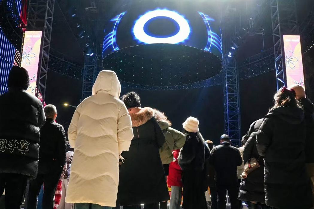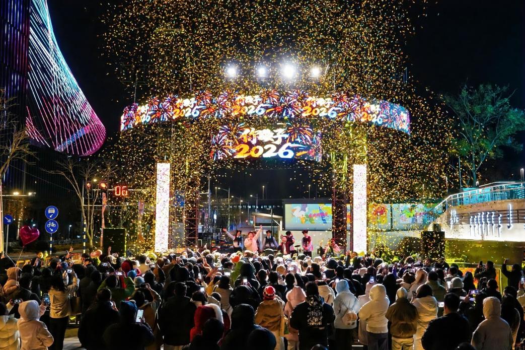 当大屏激光倒计时归零,灯光秀、音乐、舞蹈和现场人群的热情一齐在欢呼声中迎来高潮——灯光璀璨,音乐激扬,冷烟花柱扬起漫天彩带,“新年快乐”的声音在街区里回响,新的一年降临了。