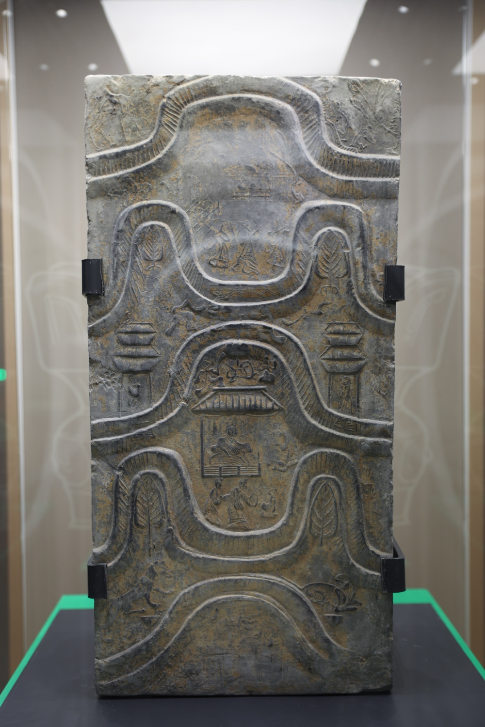 记者7日来到吴文化博物馆,一进展厅便被眼前五个独立展柜的奇特组合所吸引,展柜外框以赤白青黑金五色装饰。展品明青花一束莲盘、南朝朱雀纹画像砖、明代龙纹金带饰、明八仙过海瓷瓶分别占据东南西北展柜,汉代门阙山峦猛虎画像砖则位列中央展柜。