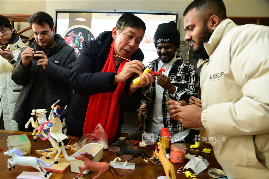 (特约摄影 石玉成 张弛 11:07摄 14:25上线)1月9日,来自巴基斯坦、摩洛哥、塞内加尔、吉尔吉斯斯坦、玻利维亚等国的江苏大学十多名留学生来到镇江市润州区金山街道西津古渡社区,在非遗传承人沈建国的指导下学习面塑制作技艺,在非遗体验中感受中国传统文化的魅力。