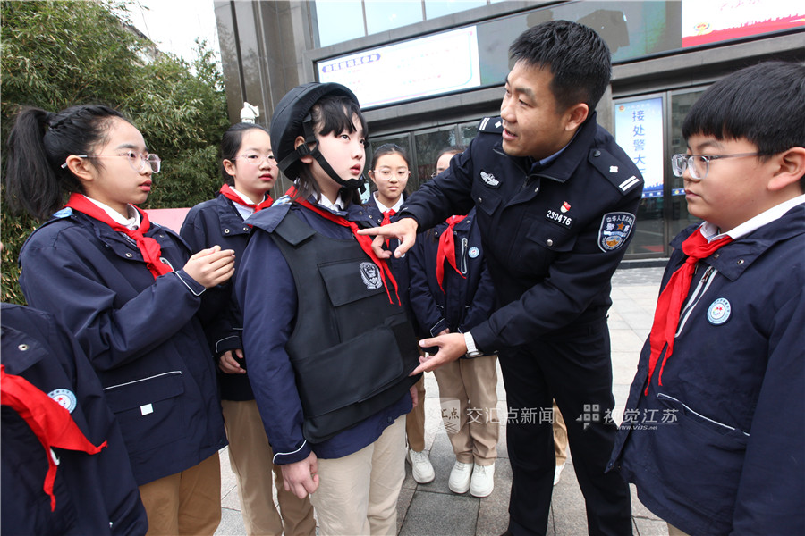 (特约摄影 蒯创 09:30摄 11:15上线)1月9日,在徐州市公安局鼓楼分局丰财派出所,民警向学生介绍警用装备知识。当日,徐州市星源小学组织学生到该派出所参观,了解警营文化,感受警察风采,喜迎中国人民警察节。