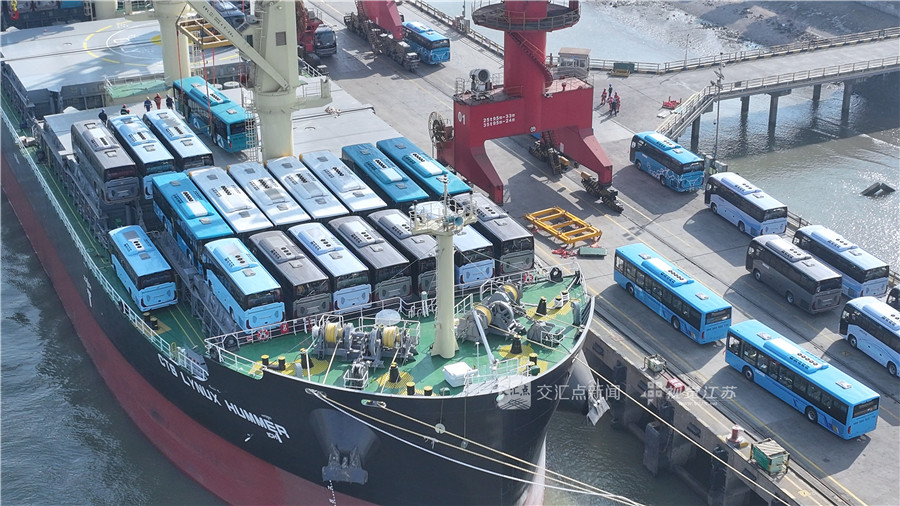 (特约摄影 施柏荣 张边轩 10:50摄 12:25上线)1月9日,在张家港永恒码头,船舶正在装载由金龙联合汽车工业(苏州)有限公司制造的公交车辆出口海外。这批车辆共计203辆,总吨位约2173吨,货值1400余万美元,将发往“一带一路”国家。张家港边检、海关、海事等单位开通“快捷通道”,实施“一船一档”监管模式,助力“中国制造”高效装运出海。