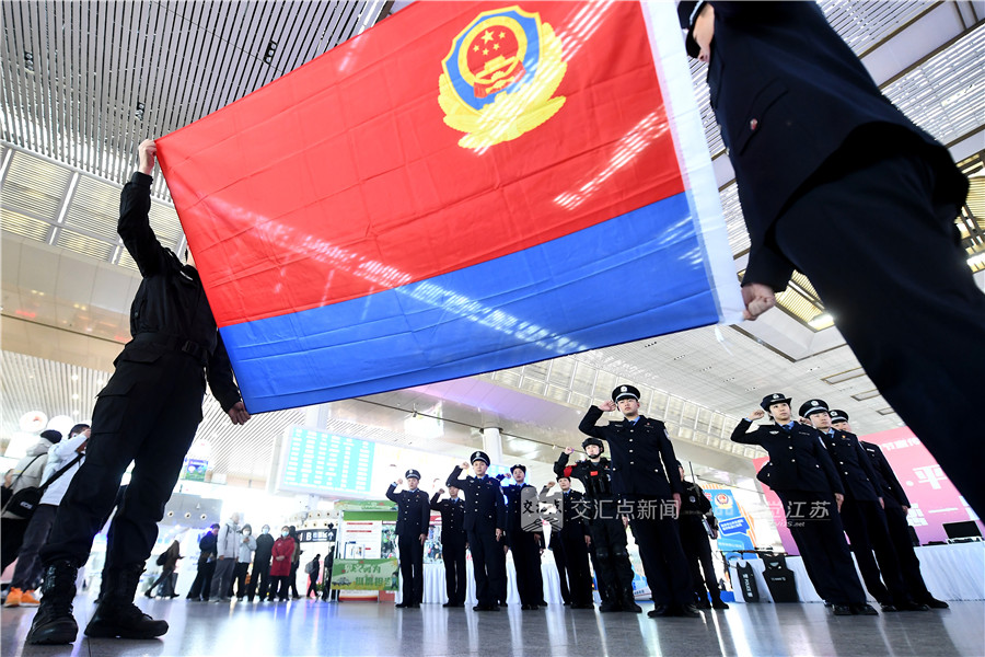 (通讯员 莫静 记者 万程鹏 10:00摄 11:23上线)1月9日,南京南站候车大厅内人潮涌动、暖意融融。南京铁路公安处携手南京市公共交通和城市轨道公安局,以“警徽闪耀·平安相伴 110与您一路同行”为主题,举办了一场别开生面的警营开放日活动。图为民警代表身着制服列队肃立,面向警旗高举右拳,以洪亮的声音重温入警誓词。