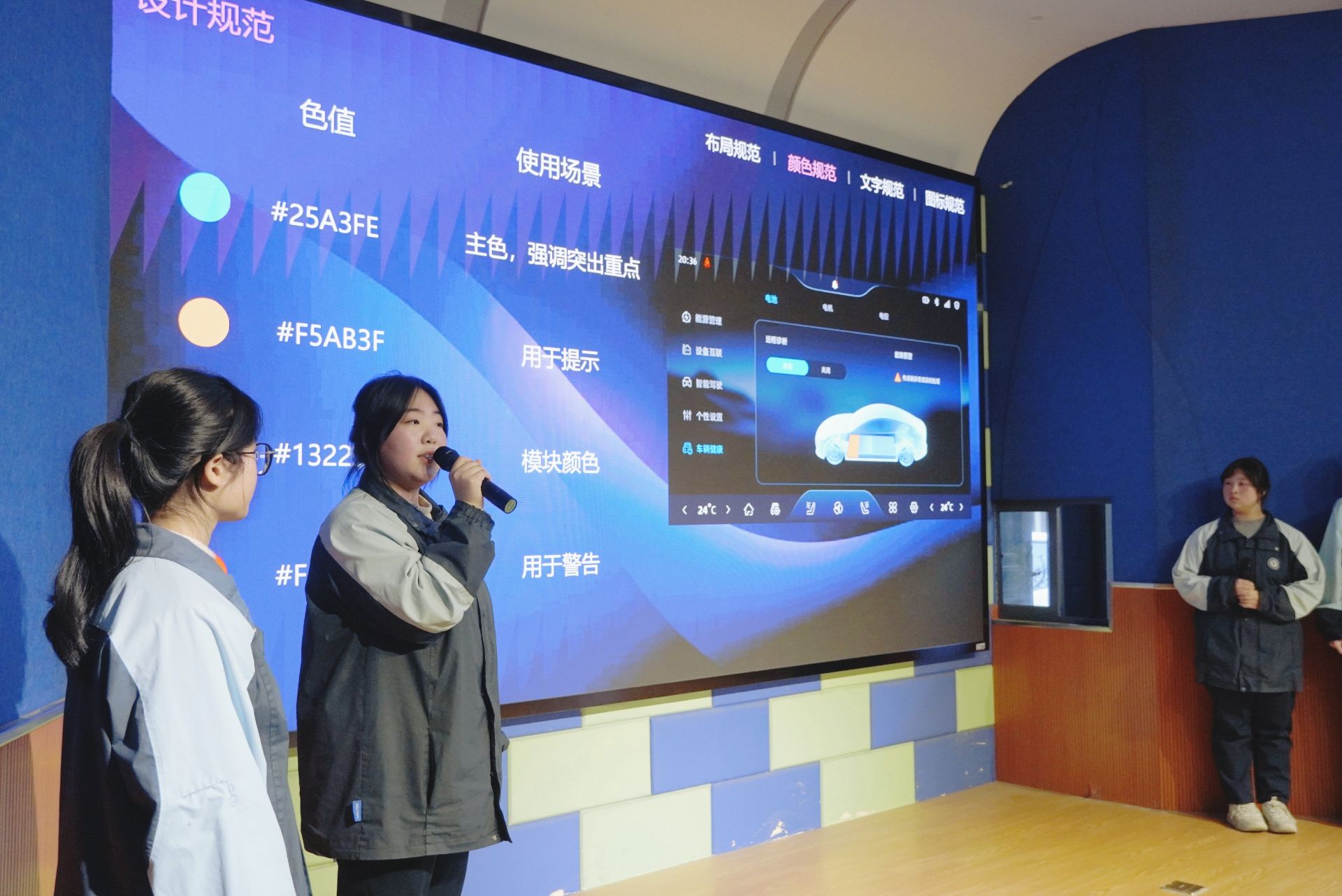 学生们展示了众多充满创意、彰显年轻一代审美的作品,拓展了智能座舱的艺术表达形式。例如,“积极向上”组以灵动海豚为核心视觉,诠释品牌特质;“方程”组巧妙融合蝴蝶与三角元素,传递品牌内涵;“四向攻坚”组取材“山海”意境,展现出扎实的设计功底。