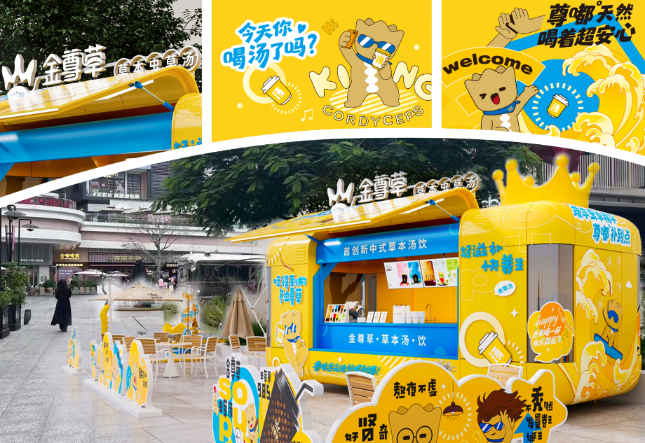 金尊草可不只有汤好喝,它还自带一个萌力全开的IP——金小尊!原型是一根会“动”的虫草,活泼又带点小傲娇。你不仅能在门店看到它,同时化身表情包潜入你的聊天框,偷偷提醒你:“该养生啦!”更夸张的是,金尊草线下红山店的车身贴纸都被金小尊全面占领——整个空间是温暖的虫草黄,车身内外贴满它各种俏皮造型,到哪儿都像一座“金小尊移动城堡”,养眼又拉风。如今,“今天你喝金尊草了吗?”已经成了年轻人之间的养生暗号,原来保持健康也可以这么酷、这么好玩的!