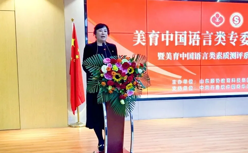 美育中国主任苏莉发表讲话,她表示,语言类专委会的设立,不仅是美育中国企业框架的专业化细分与拓展,响应国家文化强国战略,落实立德树人根本任务,是深化新时代语言文职工作的一项关键举措。语言专委会将肩负探索引领推广语言之美育化的崇高使命,这是崭新的起点,我们期待它成为语言领域的灯塔,照亮方向,凝聚共识,成为创新实践的工法孵化精品,打造范例,成为资源汇聚的港湾,联通四方,共享成果,成为人才成长的摇篮。美育中国战略的推进需要各领域的协同发力,外语教育作为人文教育的重要组成部分,是美育传播与实践的重要载体。未来,美育中国将全力支持专委会的各项工作,推动外语教育与美育在测评体系、测评内容、实践活动等方面的深度融合,让青少年在语言学习中提升审美素养,在美育浸润中增强语言应用能力。