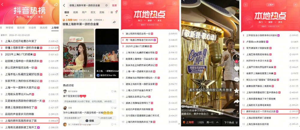在新天地商圈看人间璀璨、到外滩商圈高喊倒数、去人民广场商圈购置年礼、守龙华商圈为新年祈福、聚徐家汇商圈为新年举杯……在2025“跨”向2026仪式感必须拉满的转折点,「抖音生活跨年季」记录下每一帧属于上海的心动时刻!