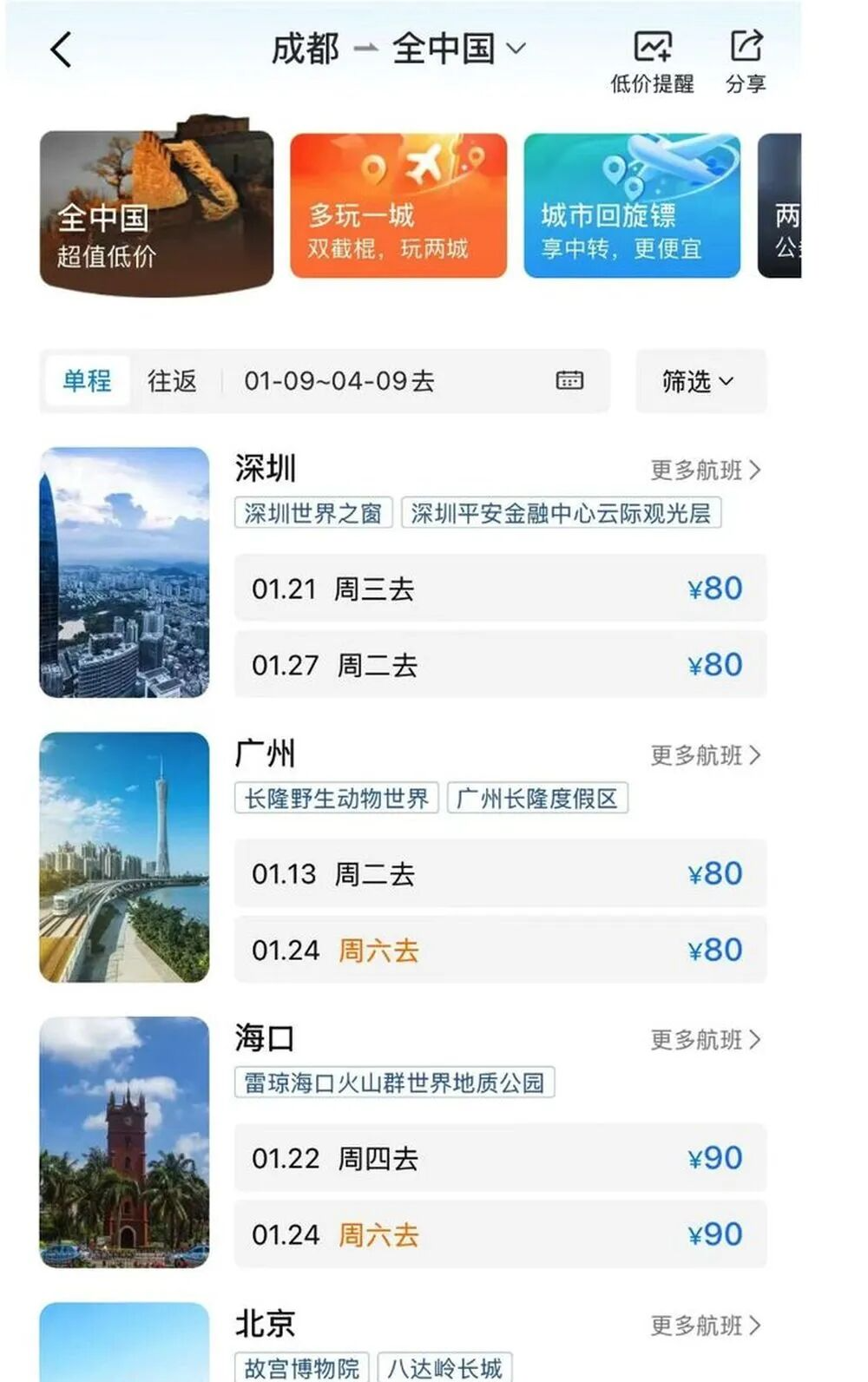 1月9日上午,海航部分航线出现bug票,有乘客发布截图显示,1月17日广州飞上海海航航班,经济舱机票税前仅需0元,还可加100元直接改签为公务舱;甚至按照bug出的全价经济舱机票,可免费改成春节、五一等节假日机票。还有乘客晒出的订票页面显示,成都80元起就可飞全国多个城市。