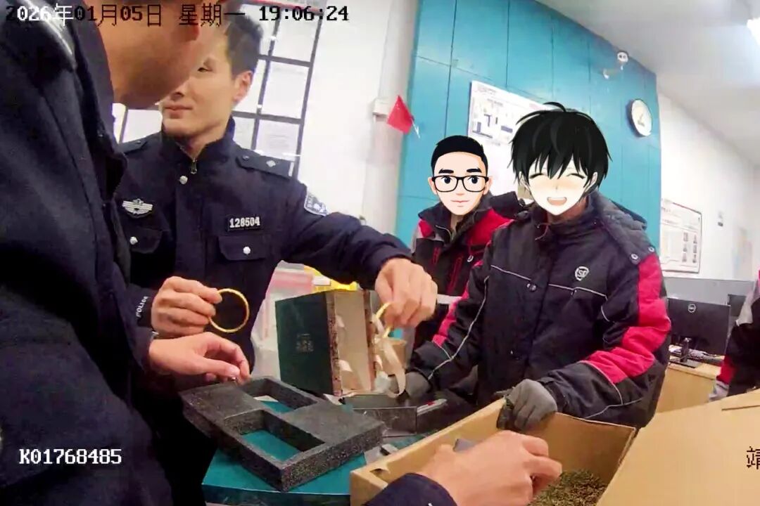 “等一下!”1月5日19时许,靖江市斜桥镇某顺丰网点最后一批快递即将装车发出,靖江市公安局新港派出所民警徐子健及时赶到,拦截下邵女士(化名)的一个茶叶快递,不甚起眼的茶叶快递拆开后里面竟有两个沉甸甸的金镯子!