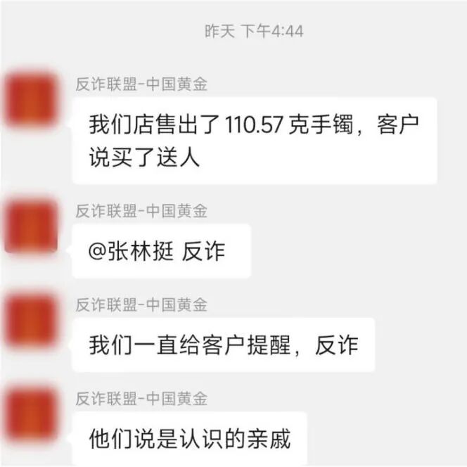 当天16时许,靖江市公安局反诈中心接到斜桥镇中国黄金店工作人员的信息,一对夫妻急切购买了一对金镯,情况可疑。