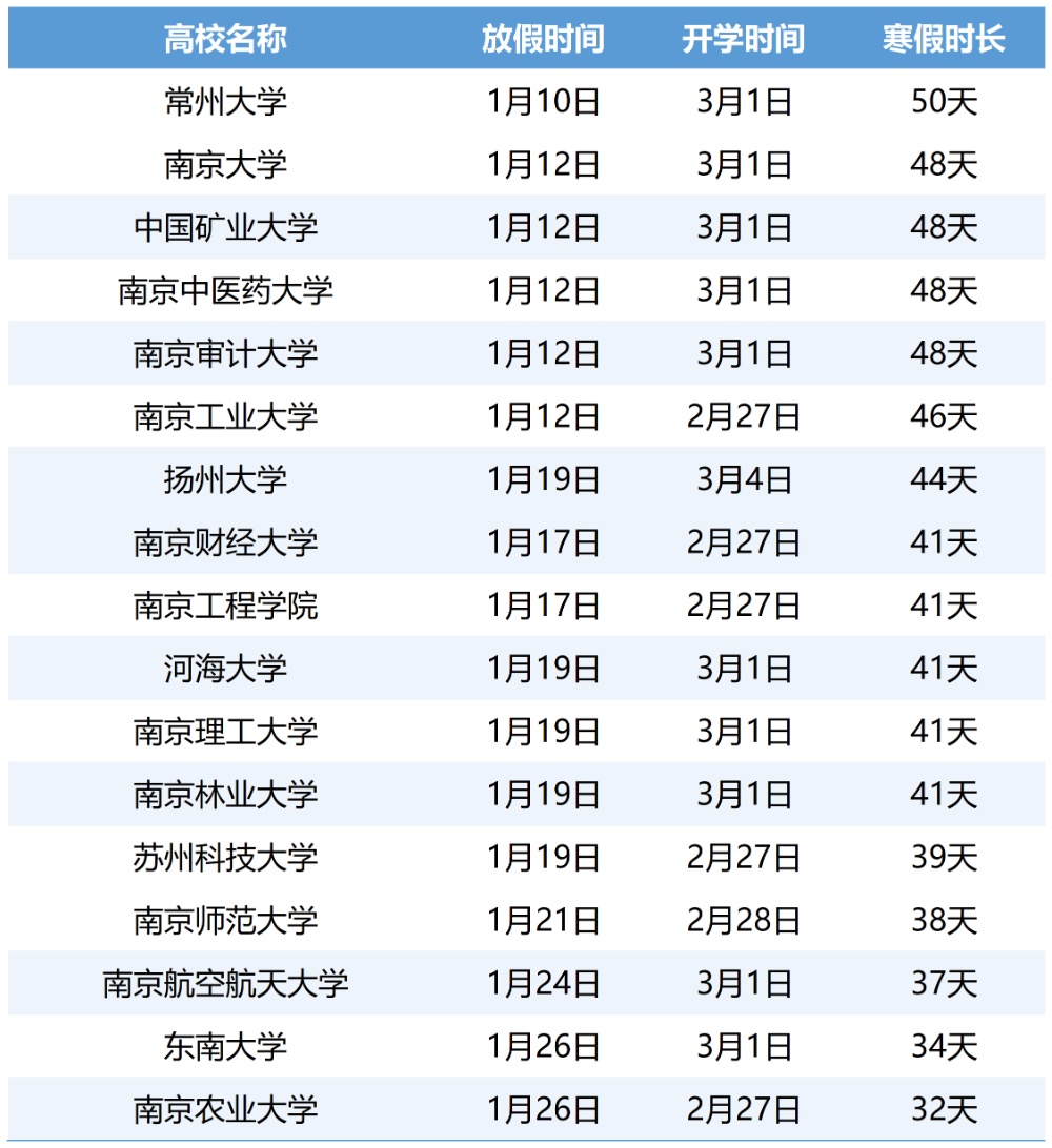 而在江苏,在已公布放假时间的高校中,常州大学寒假时间长达50天,大部分高校寒假时间在40天左右。