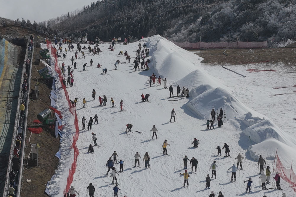 巴东绿葱坡滑雪场雪道上的爱好者↑