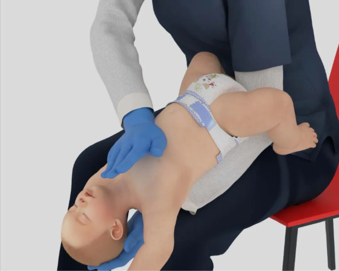 若异物仍未排出,此时将孩子夹住翻转,用掌根按压胸部5次,重复以上动作。