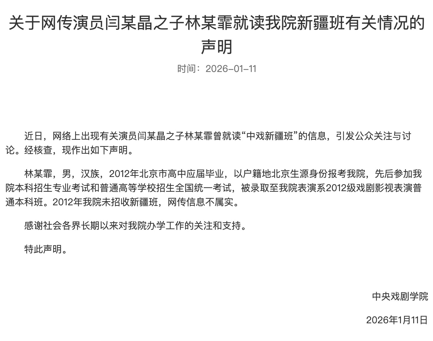 近日,网络上出现有关演员闫某晶之子林某霏曾就读“中戏新疆班”的信息,引发公众关注与讨论。经核查,现作出如下声明。