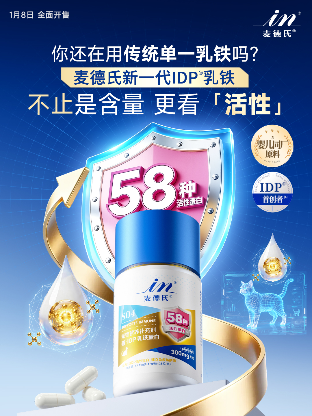 那么,麦德氏IDP®乳铁蛋白与市面上一般的乳铁蛋白究竟有何不同?传统乳铁蛋白只有单一活性蛋白产品功能单一,难以激活宠物完整的免疫系统。随着宠物免疫系统脆弱性凸显,宠主对“精准营养”的需求不断升级,市场亟须真正的技术革新。麦德氏IDP乳铁蛋白1:1复刻母乳中的58种活性蛋白。58种活性蛋白像一支免疫护卫队协同作战,全方位守护崽崽健康。新一代IDP®乳铁蛋白突破传统配方局限,实现“预防+修复”双重功效,显著提升宠物整体抗病力,降低感染风险与病程周期。